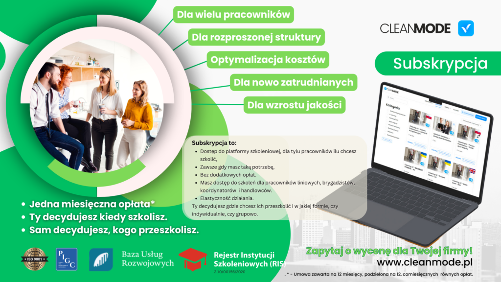 A teraz najlepsze – nie musisz organizować tych szkoleń samodzielnie. CleanMode oferuje kompleksową platformę szkoleniową w modelu subskrypcyjnym, która zdejmuje z Twoich barków ciężar edukacji pracowników. Jest to kolejna innowacja oferowana przez CleanMode na rynku cleaningowym w Polsce. Jest to rozwiązanie tanie i dostępne jak żadne inne. Dzięki naszym kursom, takim jak Cleaning AZ – Podstawy czy Nadzór, Twoi pracownicy będą mieli dostęp do najnowszych standardów w branży. Nasza oferta to nie tylko szkolenia, ale także wsparcie w budowaniu zespołu, który z dumą będzie reprezentować Twoją firmę.